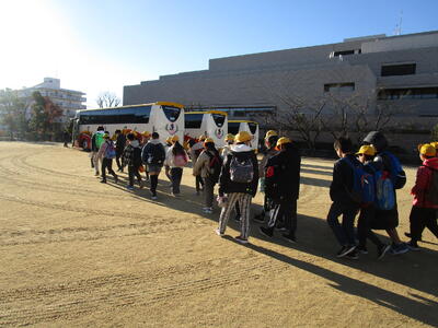 朝、少し早めに5年生が登校して体育館で出発式を行い、校外学習で「グリコピアCHIBA」「茨城県自然博物館」に出かけました。