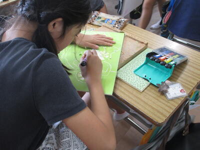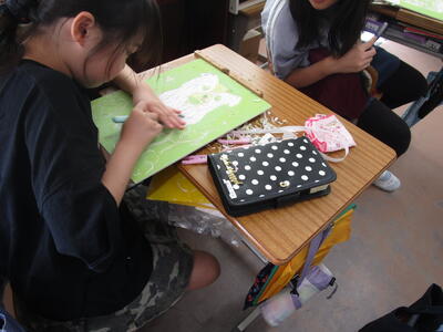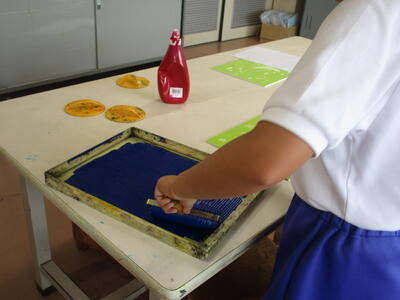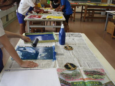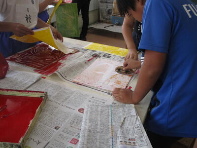5年生のほりすすみ版画の様子です。2回目の刷りや2回目の彫りや進度はいろいろです。「今、黄色にしたいところを彫っているんだ」と教えてくれる子もいました。彫刻刀で彫っているときの目は真剣です。色を重ね、どんな風に仕上がるのか、完成するのが楽しみです。