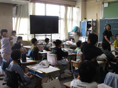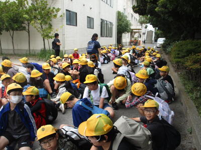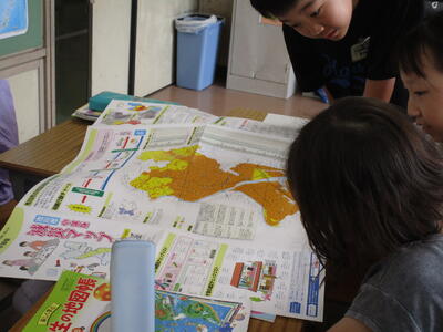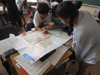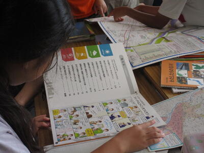 4年生の社会科の授業です。減災マップをもとに自分の住んでいる場所の状況を確認したり、避難場所はどれくらいあるのか、数えたりしていました。資料をもとに防災について考えていました。