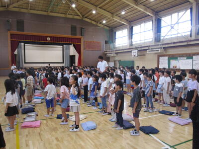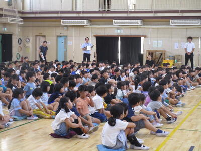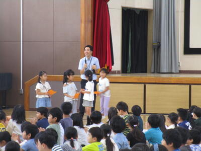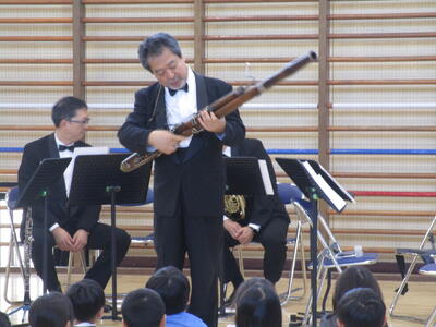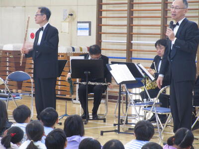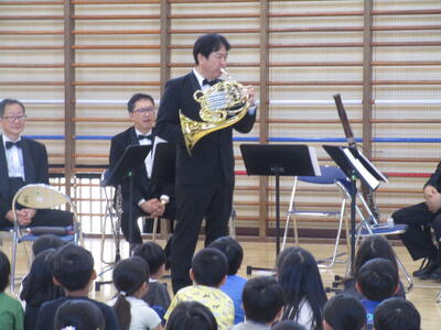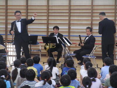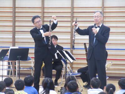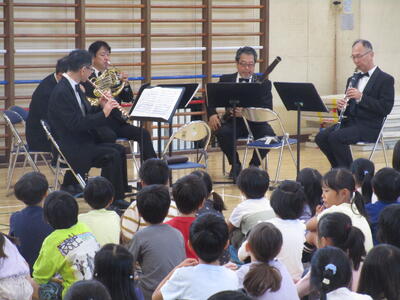 今日は芸術鑑賞教室です。「ラ・カンパーニュ」(木管五重奏)さんが来校しました。フルート、オーボエ、クラリネット、ファゴット、ホルンと一つずつ楽器の特徴や音の鳴らし方などわかりやすく教えていただきました。オーボエは練習する前に図工が必要で、「リード」は演奏者が作っていること、校歌の作者についてなどいろいろなお話が聞けました。選曲も子どもたちになじみがあるもので、自然に体を動かしたり、リズムをとったりしている様子がうかがえました。校歌も一緒に歌いました。