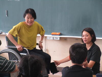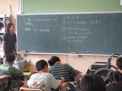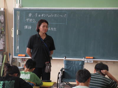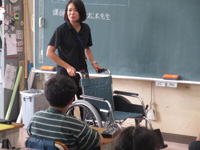 4年生は総合的な学習で福祉について学習しています。今日は松本先生を講師に招いて「車いすの操作の仕方について」学びました。車いすに乗っている人の状態に応じ、気を付けなければならないポイントがあり、みんな真剣に聞いていました。