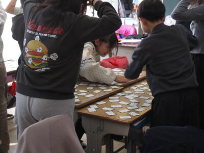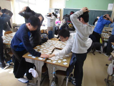 1月に百人一首大会を行いますが、練習が始まりました。先生が読んだ歌を聞いて、各グループごとに札をとっていきます。1年生は練習を始めて間もないはずですが、なんだか形になっていて、頭に手を置くルールでみんな楽しんでいました。