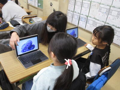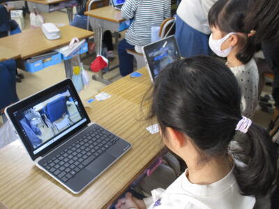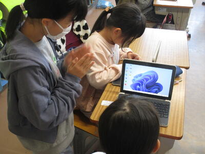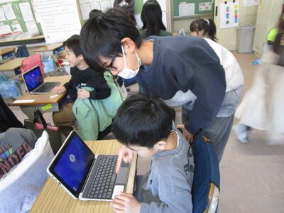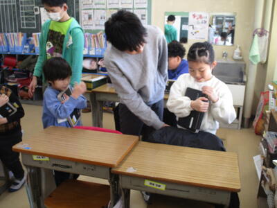 1年生のタブレットがようやく到着しました。今日は6年生にタブレットの扱い方、ログインの仕方、写真の撮り方などこれからの学習に必要な設定や操作方法を教えてもらいました。ペアやグループで次々に課題をクリアし、「やったー。できた。」など歓喜の声が上がりました。最後は赤ちゃん抱っこでタブレットを大事に抱えながら教室に戻ったり、保管庫へ入れたりしました。6年生のおかげでよいスタートが切れました。6年生、ありがとうございます。