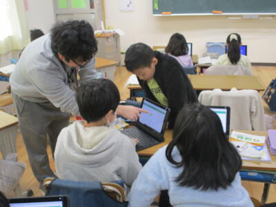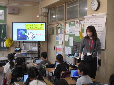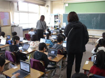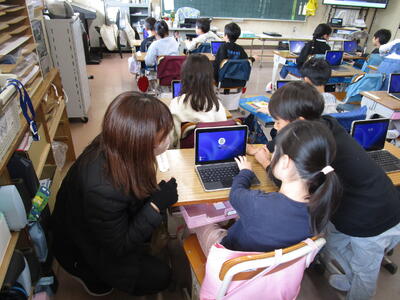 1年生の教室にICT支援員の清水先生が来てくれました。前回6年生と一緒にタブレットの取り扱いを確かめましたが、今日は一人で行っていきます。清水先生によると子ども達は恐れずに、どんどん触って進んでいくのでのみ込みが早いそうです、大人は、消えたらどうしよう、これでいいのかなと悩んでしまうため、違いがあるのだとか。前回の学習を思い出しながら子ども達はタブレットに入力、操作を進めていました。