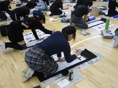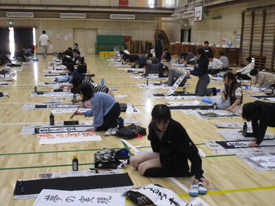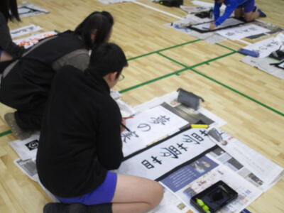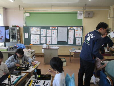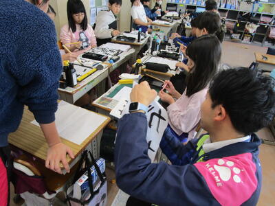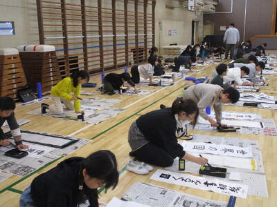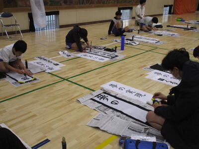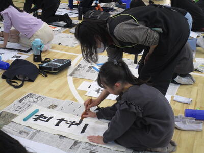 きょうは5,6年生の書初めです。さすが高学年、静かに集中して取り組む姿は立派でした。浦住先生の指導を受けながら一字一字丁寧に、文字の大きさやバランスなど筆の運びも気を付けながら書いていました。