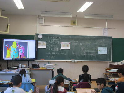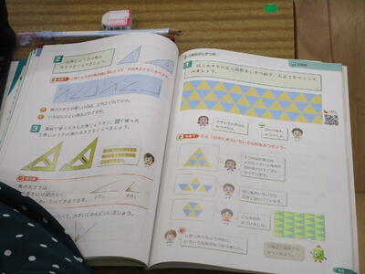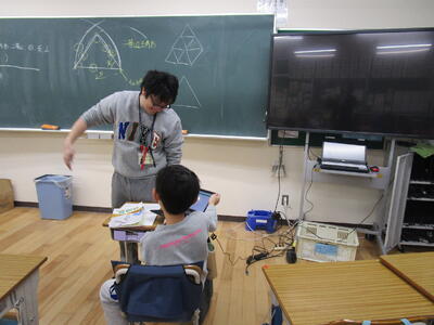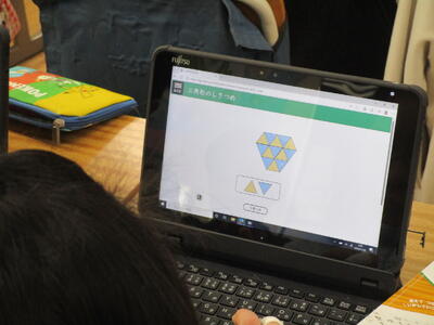 三年生の算数科で「三角形のしきつめ」について学習していました。二等辺三角形と正三角形それぞれの図形を組み合わせて大きな二等辺三角形や正三角形を作るというものです。タブレットの画面上で三角形を組み合わせて作り、みんなでめあての形なのかどうかを確かめていました。
