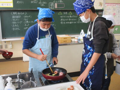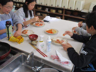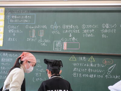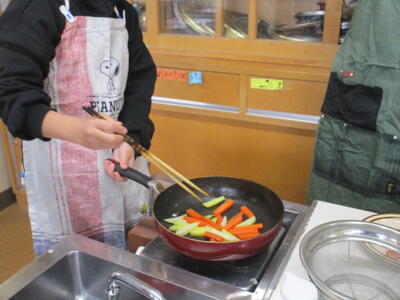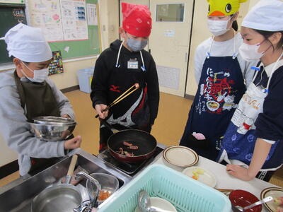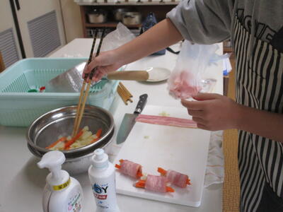 家庭科室からいい匂いがしてきました。6年生の調理実習です。「献立を工夫して」というテーマで今日は野菜のベーコン巻を調理していました。巻き方や野菜の量、さまざまでしたが、大変おいしそうでした。