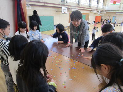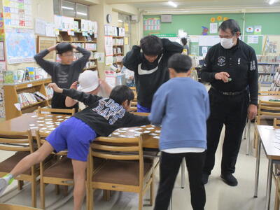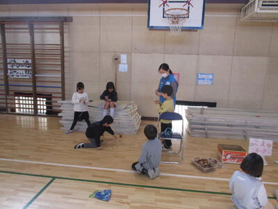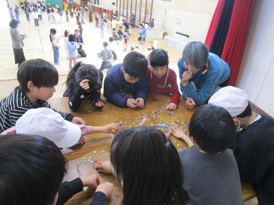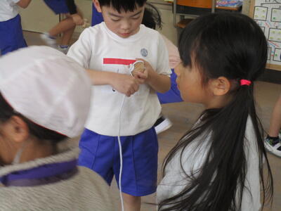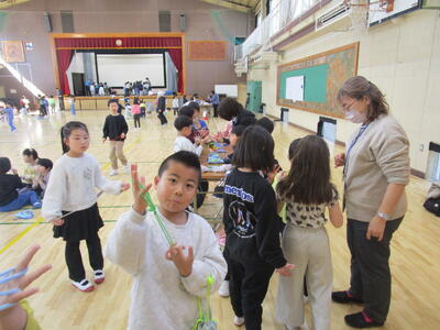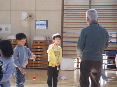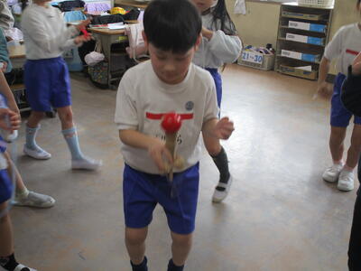 1年生が昔遊びをしていました。けん玉が得意な子はリズムに乗って失敗せずに玉を皿にのせていきます。他にも、こまやあやとりにみんな夢中です。「ぱっちんほうきできたよ」とたくさんの子どもたちが技を見せにきてくれました。