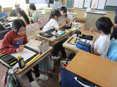 5年生の習字の学習です。「あこがれ」というひらがな4文字に取り組みます。バランスに気をつけながら練習していました。先日、書き初めの学習が行われましたが、23日から2月6日が校内書き初め展となります。廊下に掲示していますが、この期間、平日15時40分から16時30分まで保護者の方も鑑賞が可能です。