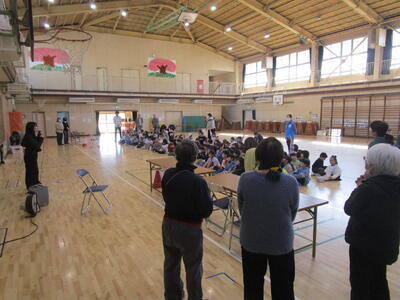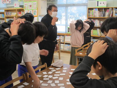 昼休みに地域の方が来校し、百人一首の読み手をしてくださいました。学校運営協議会で教育活動への支援をお願いしたところを手を挙げてくださり、今回、実現いたしました。図書室で練習会としてよびかけ、子どもたちは集中して取り組んでいました。応援の子もいて、大変盛り上がっていました。