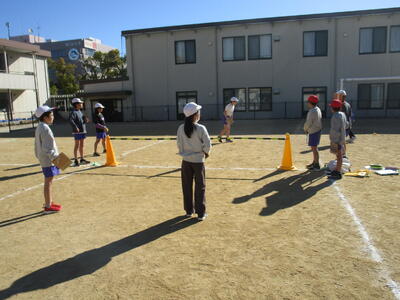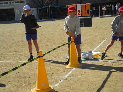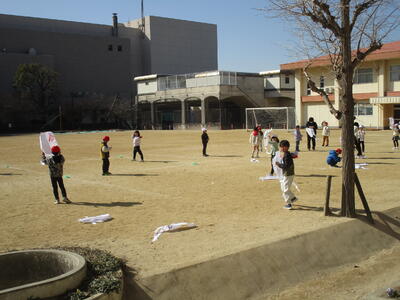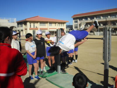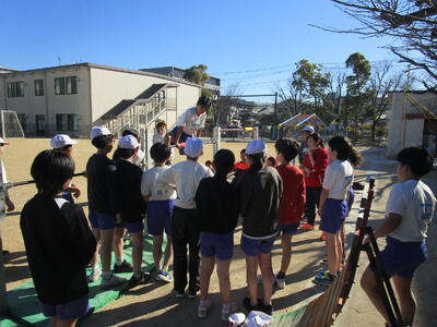 5、6年生が校庭で体育を行っています。最近は寒波の影響で冷たい強風の日々でしたが、今日はあたたかい日差しの中、体を動かしていました。6年生の鉄棒では、もう少しでできそうな子にみんなでアドバイスをしたり、できている子の技のポイントをみんなで確認したりしながら活動していました。5年生は「テニピン」という球技。「いくよ」「いいよ」のかけ声で楽しく活動していました。