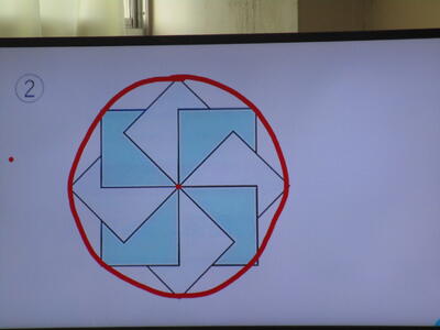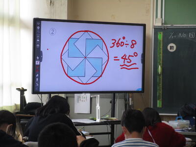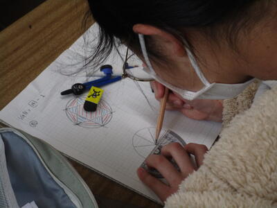 5年生の算数科で図形の学習をしていました。円に内接する形で、六角形や八角形の特徴を生かして描いていきます。コンパスや分度器などを使って真剣に取り組んでいました。