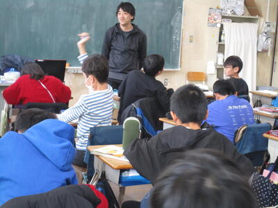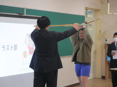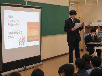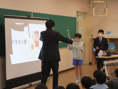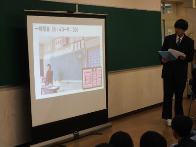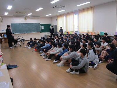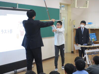 今日は第八中学校の生徒会から2名、中学校生活について説明に来てくれました。パワーポイントを使って一日の生活の流れや行事、部活動等について話してくれました。部活の体験として、剣道部の先輩を相手に竹刀で打たせてもらったことで一気に場が盛り上がり、そのあと質問タイムでもたくさんの質問が出ました。中学校に向けての気持ちが高まったように感じます。