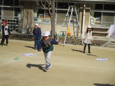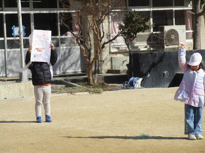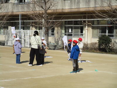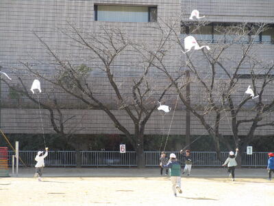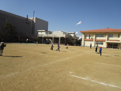 1年生の生活科で凧あげをしました。自分のお気に入りの絵が描かれていて、みんなウキウキしていました。二人一組になって走っていく人、凧を持つ人と順番にあげます。風はそんなに吹いてはいないけれど、みんな上手にあげることができました。糸を伸ばしながら高く飛ばしたいと、意欲的に取り組む姿が見られました。