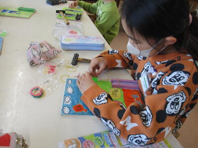 3年生の図画工作科の時間です。釘打ちをした板に球を転がして遊べるボードを作っています。まず、板に下絵を描きます。色を付けてニスを塗り、釘で道を作るだけでなくポケットを付けて楽しめるものを考えました。今日はトントン、トントンと金づちの音を響かせながら、出来上がりを想像しながら楽しそうに作っていました。