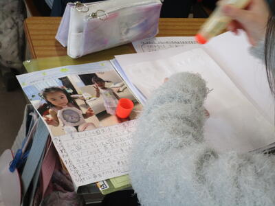 2年生の生活科の学習です。「わたし ひろがれ」で小さい頃の自分を振り返り、成長の記録を作成しています。生まれた時の様子や七五三など、かわいい写真がいっぱいです。みんな笑顔でうれしそうに活動していました。.