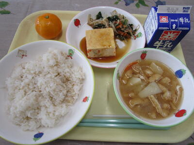 牛乳 麦ごはん 和風あんかけ擬製豆腐 ツナと野菜の胡麻和え じゃがいもと玉ねぎの味噌汁 みかん