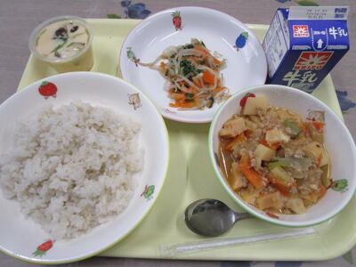 牛乳 麦ご飯 茶碗蒸し 生揚げの肉みそ煮 もやしナムル