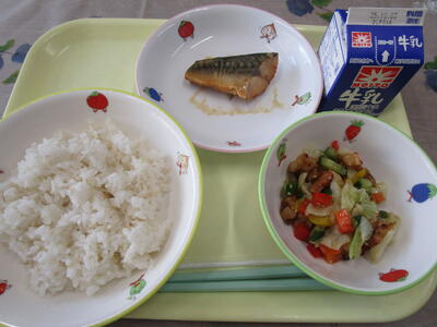 牛乳 ご飯 鯖の豆板醤焼き コロコロサラダ