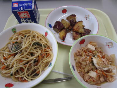 きのこスパゲティ 豆腐のオイスター炒め さつまいものセサミバター焼き 牛乳