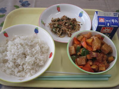 牛乳 ご飯 鶏肉と高野豆腐の揚げ煮 ほうれん草の香味和え