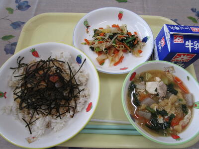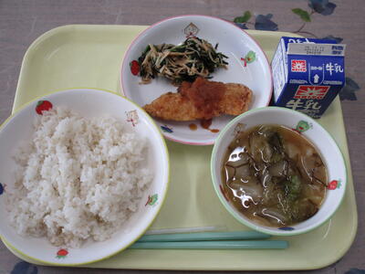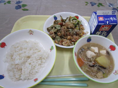 牛乳 ご飯 チキンと豆のノリ塩揚げ 白菜の昆布和え 田舎汁