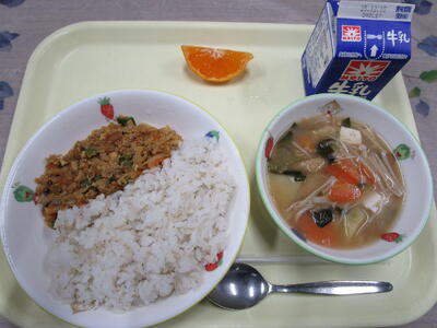 牛乳 カレーそぼろ丼 八宝味噌汁 みかん