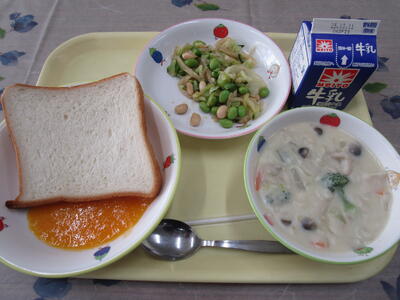 牛乳 食パン みかんジャム 白いんげん豆と大根のサラダ クリームシチュー