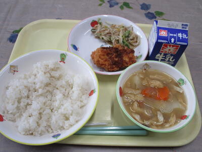 牛乳 ご飯 チキンカツ ごま酢和え じゃがいもとたまねぎの味噌汁