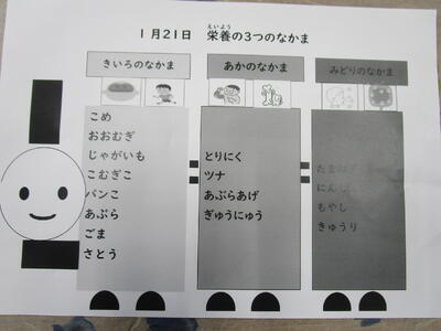 今日はヘルシーチェック3日目です。栄養の3つの仲間、きいろ、あか、みどりのなかまはつながっています。実はここがポイントです。1つの食べ物だけ、または2つだけでは栄養素が足りません。きいろ、あか、みどりの栄養の3つのなかまの力が合わさることで、この列車は元気いっぱいに走り出します。皆さんの体も同じです。先生や大人はこの3つのなかまを食べると元気に過ごせることを知っています。ですから「野菜を食べるといいよ」「苦手でも一口は食べよう」など声をかけています。
