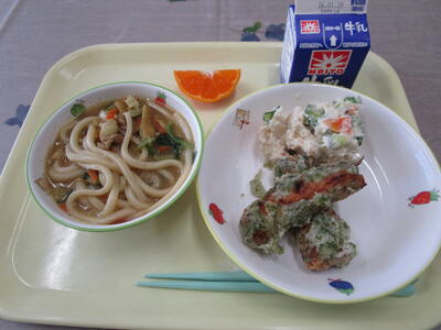 牛乳 カレーうどん ちくわの磯辺揚げ ポテトサラダ
