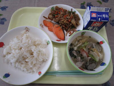 1月24日から30日までの1週間は「全国学校給食週間」です。日本の学校給食は明治22年に始まって以来、各地に広がっていきました。その後、戦争の影響などで給食が中断された時期もありました。子ども達の栄養状態が悪くなったことで給食の再開を求める声が上がり、昭和22年1月から支援を受けて給食が再開されることになりました。給食が再開される少し前の昭和21年12月24日に給食の食べ物の贈呈式がありました。この日は冬休み中だったので、冬休みと重ならない1月24日から30日の1週間を全国学校給食週間としました。今日の主菜は鮭です。.給食が始まったころの献立が焼き魚と漬物だったので、当時に合わせて玄米を炊き、魚を給食に出しました。