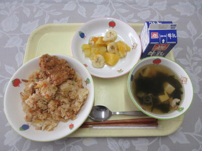 〇今日の献立【キムたくごはん・牛乳・とり肉のから揚げ・わかめスープ・フルーツポンチ】