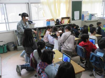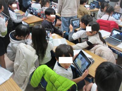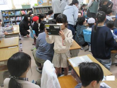1時間目に廊下に出ると、6年生の児童が大勢1年生の教室の前の廊下に集まっていたので、なんだろうと担任に聞くと、「卒業おめでとう集会」に向けて1年生が6年生のペアのお兄さんお姉さんの似顔絵を描くための写真撮りの時間でした。写真撮りの様子を見ていると、タブレットの使い方をサポートしたり、一緒にポーズをとって写真を撮ったり、写真を撮りやすいようにしゃがんであげたりと、優しい6年生の姿がいっぱい見られました。どんな、似顔絵になるか楽しみです。