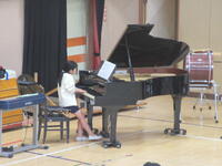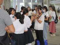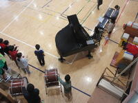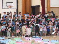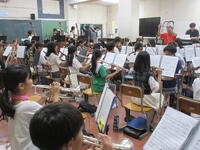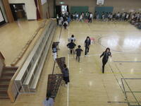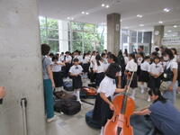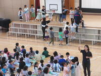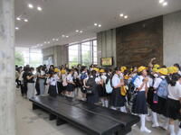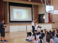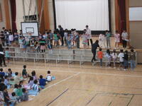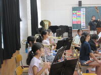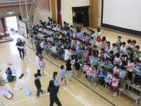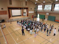 本日、「歌おう集会」を体育館で行いました。歌おう集会は、全校児童が集まり、気持ちを一つにして歌を歌う集会です。各学校で集会はいろいろありますが、「歌」に特化した集会はあまりないと思います。本校の特色の一つだと思います。暑さはありましたが、送風機を稼働し、時間を短縮し全校児童での合唱と管弦楽部の演奏を行いました。全校合唱は「校歌」「今月の歌 歌えバンバン」、管弦楽部の演奏は、「ハリー・ポッターと炎のゴブレット」の演奏でした。合唱は暑い中でしたが、リズムを体でとりながら、大きな声で全校児童が歌っていました。管弦楽部の演奏は、いろいろな楽器の演奏に子ども達は興味津々で静かに演奏を聴いていました。