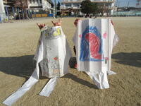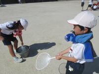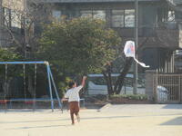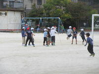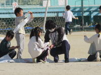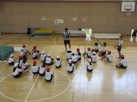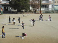今日は一段と寒い朝でしたが、1時間目から1年生は元気に校庭で体育の授業を行っていました。内容は、「ボールあそび」で、この時は、4グループに分かれ、2グループずつ向かい合って、相手のゴールに向かってボールを投げ入れるという活動でした。投げ方やボールのどこを持てばいいのか、どこを狙えばゴールに入るのか、力加減はどのくらいかなど自分で考えたり、教えあったりして楽しみながら活動していました。ゴールに入ったときは、グループのみんなで大喜びでした。