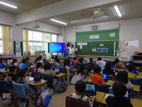 ほかのクラスに行くと、算数の授業をしていました。黒板を見ると「テープ図をつかってわからない数をもとめよう」と書いてありました。教師が大型モニターに教科書を映しながら、黒板の図をもとに、子ども達に問いかけると、一生懸命考え、答えていました。