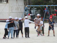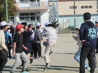 1時間目、外に出ると校庭で4年生の2クラスが、体育の授業を行っていました。腰にタグと呼ばれる幅広のひものよなものつけていたので、「タグラグビー」の授業かなと思いました。タグラグビーとは「ボールを持って走り、相手をかわしたり、パスをしたりしながらゴールに向かってトライ(得点)をするとても簡単なスポーツで、 タックルの代わりに相手のタグを取って守ります。 ぶつかることがなく安全なスポーツで、誰もが楽しめるスポーツです。」今日の授業は、ボールを使わずに、相手のタグを取る活動をしていました。手をつないだグループの中に、タグをつけた児童が一人いて、そのタグを取ろうとするのですが、うまく回転させて取らせないようにするので、なかなか取れず苦労していました。