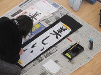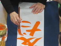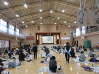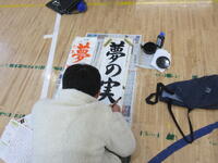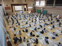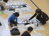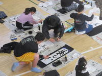これは、6年生の書写の授業の様子です。書初めの「夢の実現」という字の練習を行っていました。普段は、教室の机の上で、半紙に書いていますが、書初めは別で書初め用の長い用紙を使って、床で行います。普段と違う紙の大きさや姿勢に戸惑いながらも、一人ひとり、集中して練習を重ねていました。