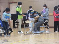 関係団体から車いす等を借りてきて、福祉の学習としていろいろな体験活動をしました。(「妊婦体験」「車いす体験」「目の不自由な方の体験」「お年寄り体験」)言葉では聞いたことがある「妊婦」「目の不自由な方」「お年寄り」「車椅子」ですが、聞くのと実際に体験するのとは大違い。疑似体験しながら、多くのことを感じたと思います。