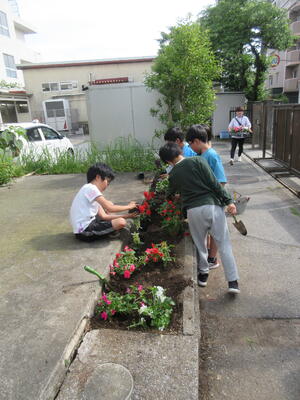 学校では委員会活動というものがあります。本校の委員会は12の委員会がありますが、その中に「栽培委員会」があります。栽培委員会は、校内の花壇の植え替えや花や植物への水やりをしてくれています。まさに、学校の特色である「花いっぱいのかぎ」を握る委員会です。今日は、児童みんなでプランターに花の苗を植えたり、学校正門近くの花壇に、花の苗植えの活動を行いました。今後機会を見ながら、ほかの委員会の活動も紹介できればと思います。