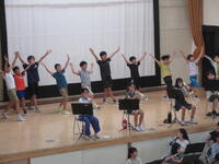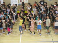はじめの発声練習はピアノに合わせて「ハロー」の声出しでした。徐々に高音域になるにつれて、歌声が透き通った響き合う声になっていきました。喉の調子も整ったところで、今月の歌「うたえバンバン」を合唱しました。毎朝クラスで歌っていたこともあり、833名の合唱は活気溢れる迫力の歌声となりました。最後には5年生の「ダンス隊」がステージに登場しました。ダンス隊オリジナルの振り付けを子供たちはあっという間に覚え、踊りながら楽しく最後まで歌いました。