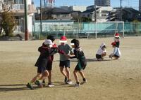 1時間目、外に出ると校庭で4年生の2クラスが、体育の授業を行っていました。腰にタグと呼ばれる幅広のひものよなものつけていたので、「タグラグビー」の授業かなと思いました。タグラグビーとは「ボールを持って走り、相手をかわしたり、パスをしたりしながらゴールに向かってトライ(得点)をするとても簡単なスポーツで、 タックルの代わりに相手のタグを取って守ります。 ぶつかることがなく安全なスポーツで、誰もが楽しめるスポーツです。」今日の授業は、ボールを使わずに、相手のタグを取る活動をしていました。手をつないだグループの中に、タグをつけた児童が一人いて、そのタグを取ろうとするのですが、うまく回転させて取らせないようにするので、なかなか取れず苦労していました。
