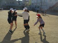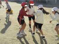 今日は一段と寒い朝でしたが、1時間目から1年生は元気に校庭で体育の授業を行っていました。内容は、「ボールあそび」で、この時は、4グループに分かれ、2グループずつ向かい合って、相手のゴールに向かってボールを投げ入れるという活動でした。投げ方やボールのどこを持てばいいのか、どこを狙えばゴールに入るのか、力加減はどのくらいかなど自分で考えたり、教えあったりして楽しみながら活動していました。ゴールに入ったときは、グループのみんなで大喜びでした。