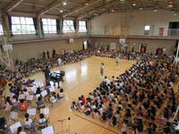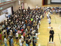 全校児童が入場したところで、専科教員から「いつもはクラスでCDに合わせて歌っているけど、今日は管弦楽の伴奏で歌えますよ」、「市川市で管弦楽がある小学校は2校ありませんから、鬼高小の歌おう集会はとても貴重な体験です」という話がありました。