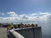 学校を出発し工場地帯や物流倉庫街を抜け行徳港に着きました。防波堤からは雲が湧く海や遠くの街並みが見えました。次に、江戸時代に航路安全を祈願して建てられた常夜灯を見学しました。水辺の土手ではバッタを見ることもできました。