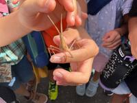 2日目は海を臨むホテルの芝生広場で、朝の集いからスタートしました。朝食を食べ、8時30分には岩井海岸に向けて出発しました。みんなで力を合わせて引いた地引網は、大漁ではありませんでしたが大きな魚も入っており、子供たちの歓声があがっていました。漁協の方からお魚の話を聞いた後、子供たちは、海に入ったり、浜辺で貝を拾ったり、砂を掘ったり、思い思いに時間を過ごしていました。