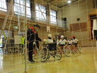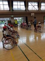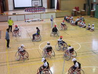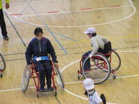 講師には日本車椅子ハンドボール連盟の皆様をお招きして、車椅子ハンドボールの体験学習をさせていただきました。講師からのお話を聞いている際は少し緊張した表情だった3年生も、実際に車椅子に乗ってゲームを体験し始めると、活発に動き回ったり、声援を送り合ったりしていました。体験後、「足が不自由な人でも車椅子を使えば運動ができて素晴らしい」、「競技に使用する車椅子は通常の物と違い、選手が落ちないように工夫されていることを知った」、「体験させてくれてありがとう」、他の感想が寄せられました。