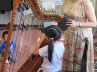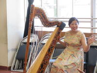 コルトンプラザ前からバスでホールに向かいました。到着後、ロビーで楽器を準備しました。