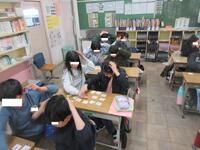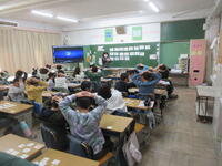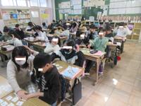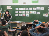 4年生の教室をのぞくとちょうど外国語活動の授業でした。外国語活動は、教科書中心というよりは、活動を通して楽しみながら学ぶことが多く、この時は「かるた形式のゲーム」を通して学習した内容を確認していました。机の上には、カードが並べられ、教師がカードの言葉を言ったら、子ども達が同じ言葉をリピートしながら続けていきますが、教師が「Take(テイク)」と言ったらカードを取るというものでした。子ども達は、教師の言う言葉に耳を澄ませ、集中していましたが、「テイク」と言われた瞬間、いたるところでカードを取る音と歓声が聞こえてきて、楽しみながら学習している様子でした。